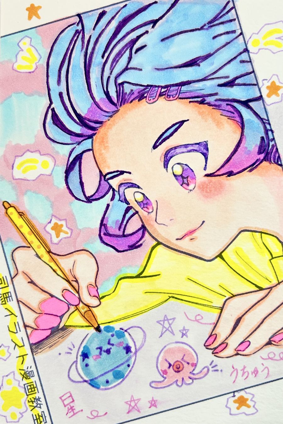 画面全体から伝わってくる「楽しい!」が目を引く作品でした。顔まわりや暗くなりがちな手の影などに鮮やかなピンクを入れ、見てほしいところをしっかり引き立たせているところが技ありです。線画がないところは表現の見せどころ。ステッカー風背景や、女の子が描いているイラストまでしっかり描きこんだところも好ポイントになりました。