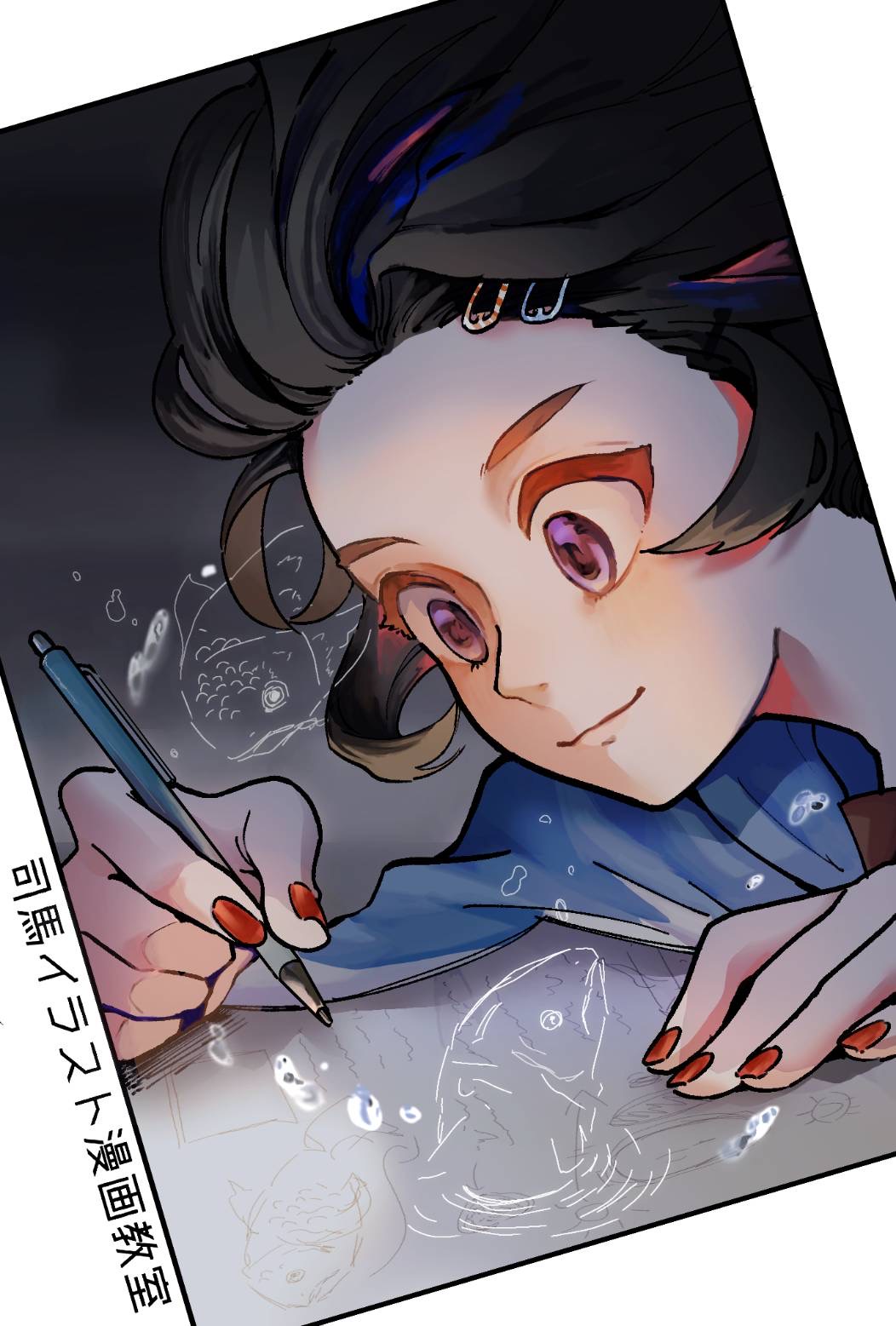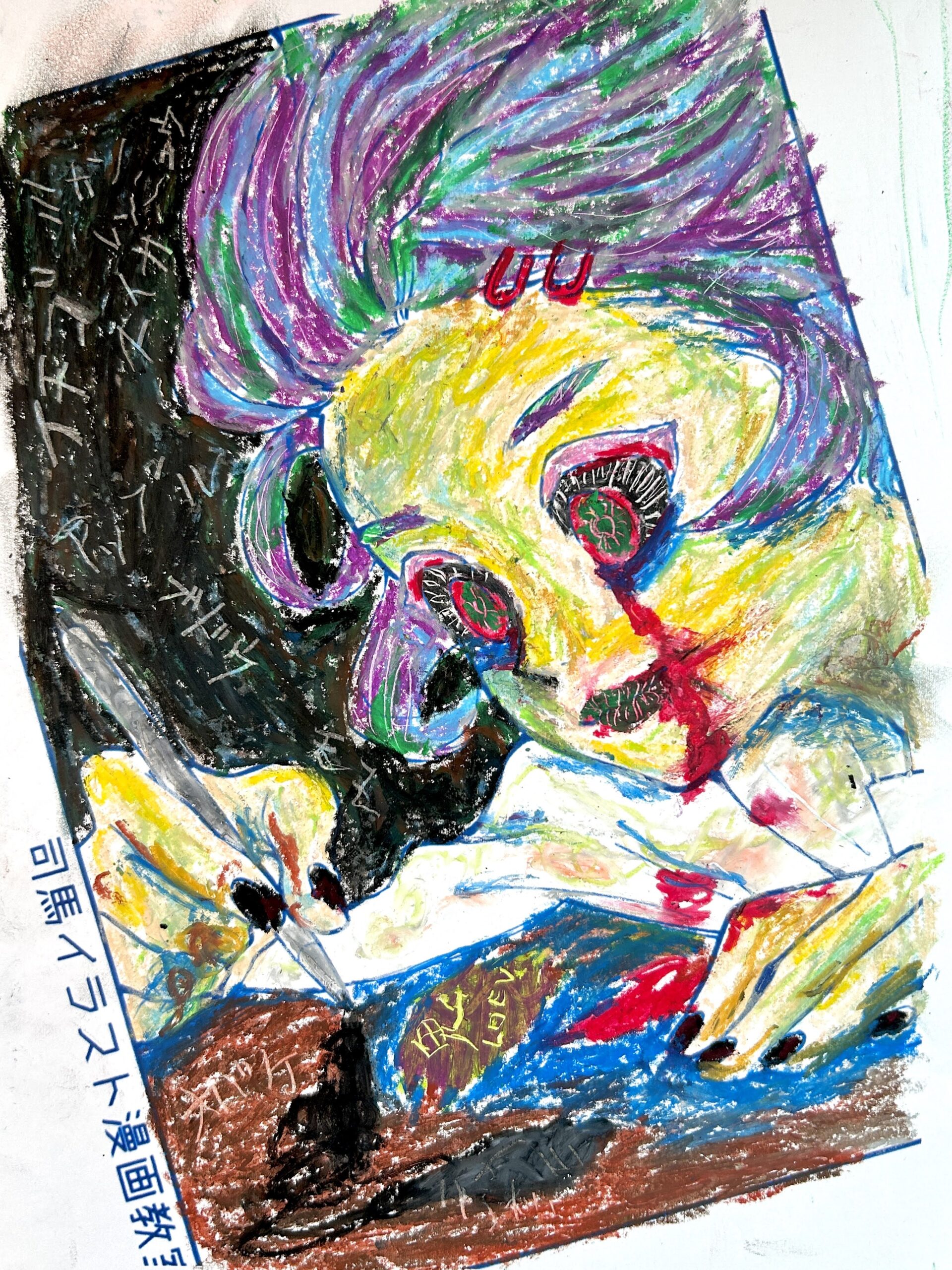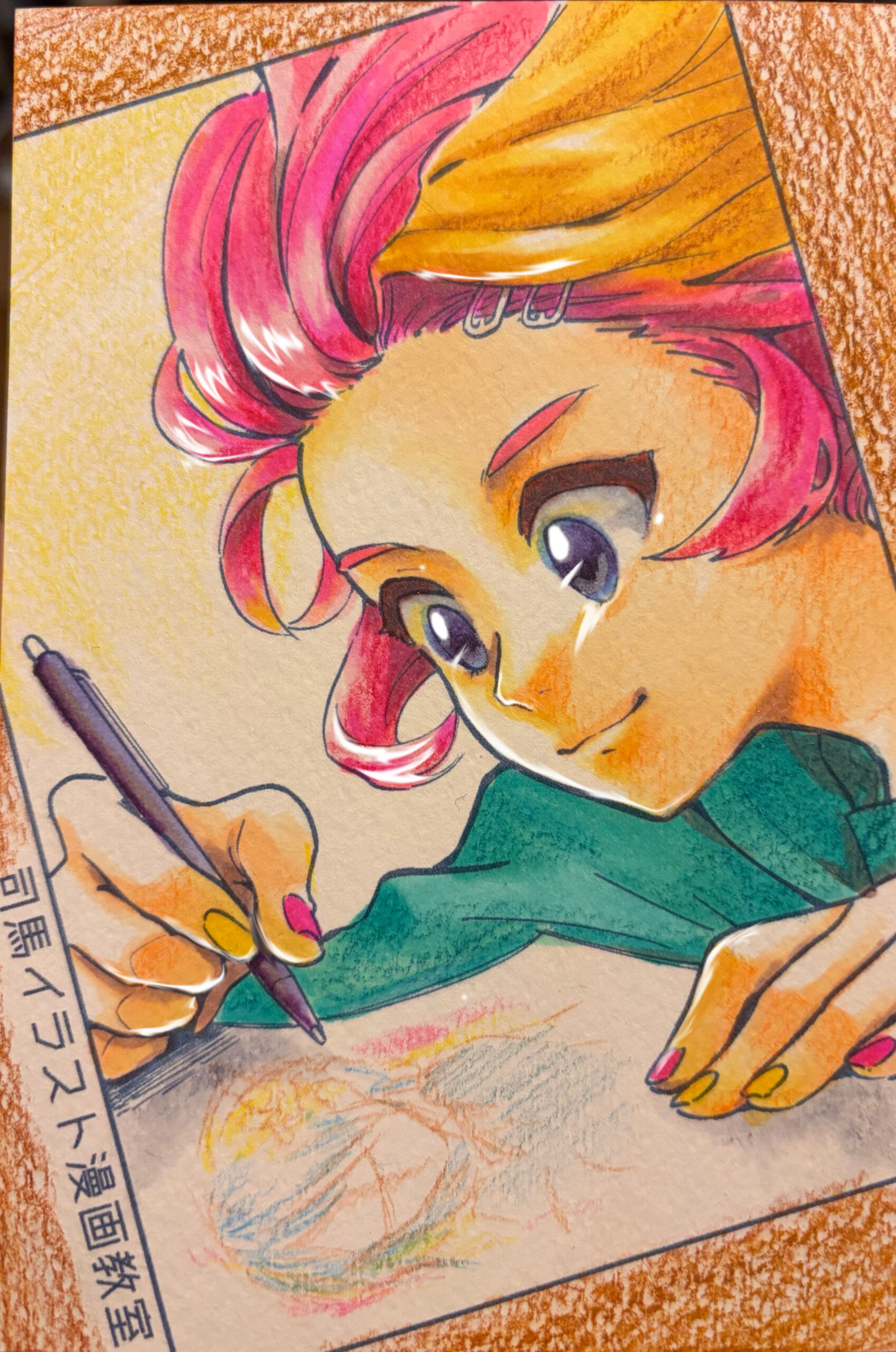 色とりどりの髪の毛と、ペンを持つ手が印象的な一枚です。